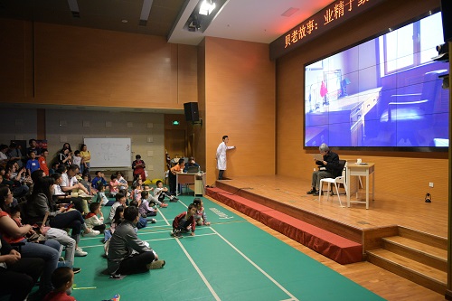 在六号楼中庭,安排了3场科普分享秀,科普名家叶盛博士出版的科普读物分享及签赠吸引了小朋友们的围观和热烈欢迎;富有亲和力的吴帆老师以科普大姐姐的形象为学生朋友们分享了免疫学小常识;杜宝臣博士介绍了“生物医学大讲堂”的创建和发展历程,受到诸多家长和学校老师的关注,咨询交流络绎不绝。