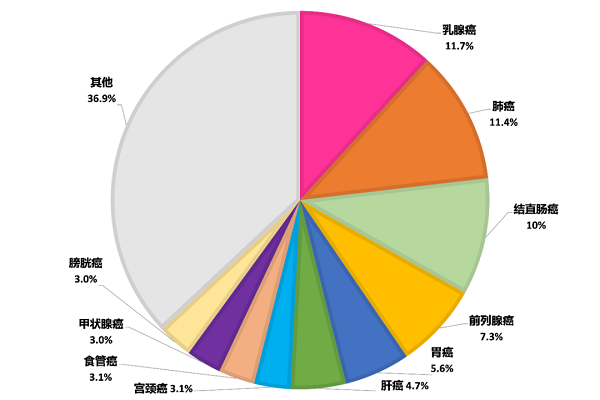 图1 2020年癌症新发病例数前十的癌症类型(https://www.iarc.who.int/fr/)