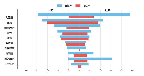 图2 2020年中国和全球癌症新发病例数前十的癌症类型(https://www.iarc.who.int/fr/)