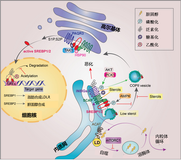 细胞需要对环境作出适当的反应,才能使其生存、维持和生长。细胞外信使分子与同种细胞受体结合,将外界刺激传递到细胞内部。受体的激活引发一系列下游信号事件,导致基因表达的改变。这种将细胞外信号转导到细胞核的过程在癌细胞中是失调的。研究发现甾醇调节因子结合转录因子(sterol regulatory element binding transcription factor, SREBP)可调控脂肪酸、胆固醇代谢,许多原癌信号通路可以靶向调控SREBP,将癌变与脂代谢联系起来【6】(图4)。