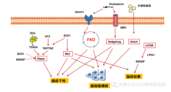 Notch信号是通过Notch配体与Notch受体的结合而启动的,是由细胞与细胞之间的接触介导的。Notch信号通路活化可促进乳腺癌的发生【7】。胆固醇外流调控Notch1的启动子,在转录水平上调控Notch信号通路的活性,进而调控造血干细胞的形成和分化【8】。SREBP和戊二烯酸盐途径可以调控Hippo信号通路活性,对于乳腺癌细胞的增殖有重要作用【9】。脂质代谢可以调节Hedgehog信号通路【10】,胆固醇能共价修饰Hedgehog及其下游的Smo蛋白【11】,氧化胆固醇可以激活Smo从而激活Hedgehog信号通路【12】。Wnt信号通路与癌细胞的代谢重编程有关【13】,β-catenin在乳腺癌细胞的代谢和能量平衡调节中起重要作用【14】,Wnt信号通路持续激活导致脂肪积累【15】。 mTOR调节SREBP和其他脂质代谢调节器和效应,mTOR抑制剂可以阻断与脂肪生成有关的基因的表达,并阻止SREBP的核积聚【16】。这些癌症干细胞相关信号途径都与脂质代谢重编程有着密切的关系(图5)。
