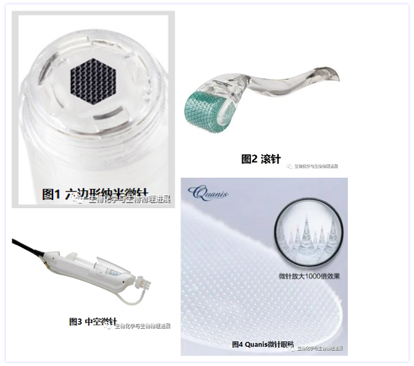 根据微针给药的方式,可以将微针分为5种类型[6]:(1)实心/固体微针:由金属或不能降解的材料制成,在皮肤上打开即时微通道,允许药物或功效性成分更好地渗透。目前医美领域常用的纳米微针(图1)及滚针(图2)就属于固体微针。(2)涂层/包被实心微针,在微针针体和针尖上涂有活性成分,刺入皮肤后涂层成分在皮肤内快速溶解。(3)中空微针,利用空心微针刺破皮肤形成的微针孔/针腔将液体药物注入皮肤。目前医美领域的美塑疗法中常用此微针连接负压后经皮给药,俗称"水光针"(图3)。(4)溶解型微针,由生物可降解和生物兼容的材料制成,易于在体液中降解和溶解,从而释放装载的药物成分。日本著名美妆品牌Quanis克奥尼斯的微针眼贴(图4),就是将玻尿酸制成200 μm的微针形态,通过按压刺入皮肤,起到皮肤深层补水的作用。(5)水凝胶微针,由可膨胀的水凝胶聚合性材料制成,微针刺破皮肤后,快速吸收组织液膨胀,药物再通过膨胀的水凝胶微针形成的微孔道输送出来。