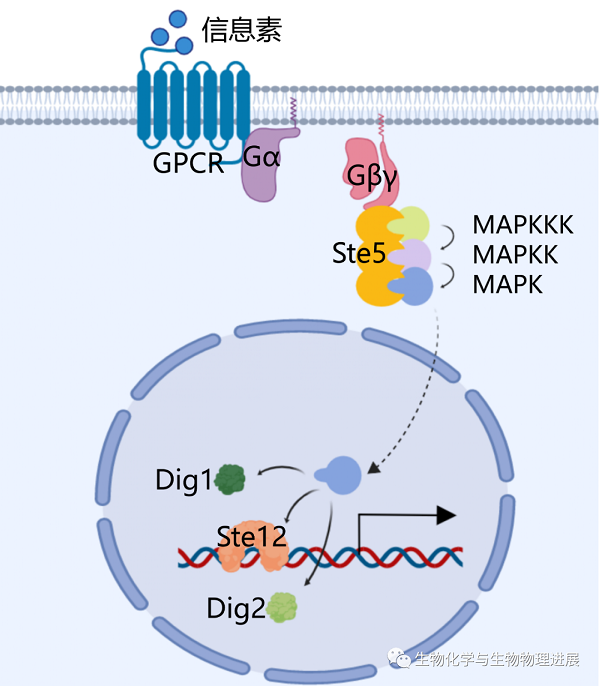 MAPK(丝裂原活化蛋白激酶)信号通路是真核生物信号传递网络中的重要途径之一,是细胞增殖、分化、细胞凋亡以及正常条件和病理条件下应激反应的关键信号通路。MAPK信号传导是酵母细胞融合的第一步。当信息素与G蛋白偶联受体(GPCR)Ste2/3结合时,异源三聚体G蛋白被激活,Gβγ亚基迅速与Gα亚基分离,并将支架蛋白(Ste5)招募到质膜上。Ste5通过招募和调节MAPK模块来启动和放大交配信号,这些模块包括丝裂原活化蛋白激酶激酶激酶MAPKKK(Ste11)、丝裂原活化蛋白激酶激酶MAPKK(Ste7)和丝裂原活化蛋白激酶MAPK(Fus3)[2]。磷酸化的Fus3与Ste5快速分离,进入细胞核中,磷酸化核内的Dig1、Dig2和转录因子Ste12蛋白,触发Dig蛋白与转录因子Ste12的解离,从而启动信息素诱导型基因的转录(图1)。