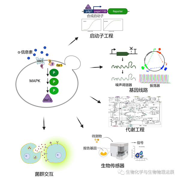 酿酒酵母交配特异性MAPK信号通路为合成生物学提供了多种元件,如G蛋白偶联受体、支架蛋白和信息素诱导型启动子。合成生物系统的构建采用的是一种"自下而上"的正向工程学方法,其构建可分为三个层次,即生物元件、生物装置和生物系统。具有不同功能的生物系统通过彼此间的相互通信和协调进一步构成复杂的多细胞互作系统[3]。通过改进现有的元件或设计新的基因线路,并应用"设计-构建-测试-学习"原则,酵母交配信号通路的合成生物学应用主要体现在以下五个方面--在启动子工程中调控基因表达,在代谢工程中将生长与代谢解耦,在生物传感器中灵敏检测和放大信号,在基因线路中编辑生物功能,以及在多细胞群落中的细胞间通信(图2)。