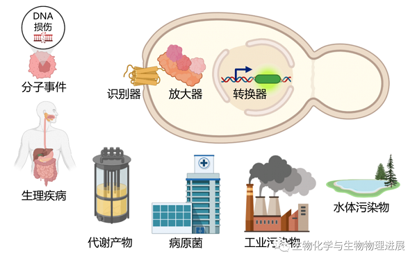 生物传感器(Biosensor)是一种对生物物质敏感并将其浓度转换为可测量信号进行检测的装置系统,包括三个元素:一个能够与目标分子相互作用的识别器,一个放大输出的放大器和一个将细胞响应转换为可测量信号的转换器[4-5]。这三种元素的共同努力允许在单细胞水平上快速检测各类小分子。基于酿酒酵母的生物传感器已被用于检测多种分子和生理事件,包括但不限于多肽、重金属、海洋毒素、异源产物,以及由诱变剂和致癌物引起的DNA损伤(图3)。