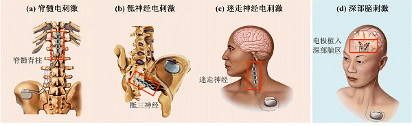 人类利用电刺激来治疗疾病的方法可以追溯到远古时期,那时候虽然人类对于电的本质一无所知,但已经利用鳐鱼等动物所产生的电来缓解头痛病。当人与鳐鱼共处于同一水池之中时,就会遭受鳐鱼产生的数十至数百伏脉冲的电击,可以调节人体神经系统的活动。如今,神经调控已广泛用于临床,治疗各种神经系统疾病。例如图1所示,脊髓电刺激用于治疗慢性疼痛,骶神经电刺激用于治疗膀胱排尿功能障碍,迷走神经电刺激用于治疗药物难治性癫痫等[1-4]。还有治疗失聪的人工耳蜗、改善睡眠呼吸暂停的舌下神经刺激以及恢复残障肢体功能的功能性神经电刺激等[5-7]。这些方法的共同特点是,都施加电刺激于神经纤维,也就是神经元的轴突。通过诱导轴突上的电活动来调控神经元活动及其控制的肌肉活动。