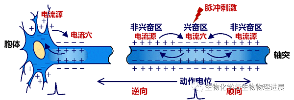 如图2所示,在细胞外空间施加单个阈上强度的电脉冲刺激时,可以兴奋轴突并诱发其产生动作电位。兴奋区电流(即钠离子流)由膜外流向膜内,在胞外形成“电流穴”。在电位差驱动下,两侧的非兴奋区电流由膜内流向膜外,在胞外形成“电流源”,并使得非兴奋区去极化,进而导致动作电位沿轴突向两侧传导。其中,传向轴突末梢的称为顺向传导,可以调控下游突触后神经元的活动;传向神经元自身胞体的称为逆向传导,可以调控胞体活动。
