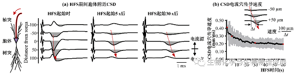 CSD分析的结果表明,在持续的轴突HFS期间,胞体附近CSD电流穴的传导速度变小,即动作电位的传导速度变慢(图5)。这说明,虽然直接受HFS作用的是轴突,且轴突阻滞已经削减了HFS对于胞体的兴奋作用,但是胞体的状态仍然会发生改变。
