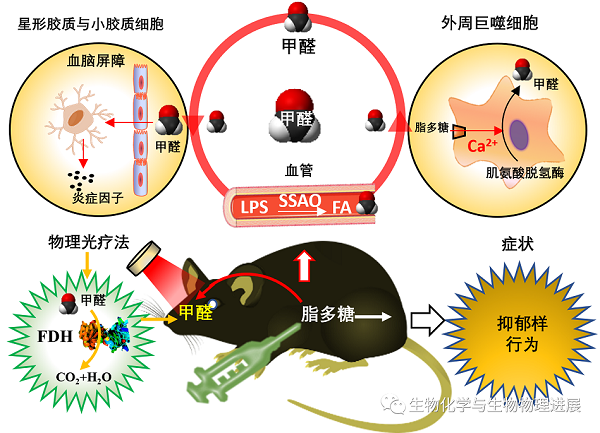 在近几十年中,炎症反应被认为是重度抑郁患者发生的关键原因。同时,外源性甲醛(FA)重复暴露会诱发小鼠出现抑郁样行为,并被认为直接触发了神经炎症。温州医科大学程建华、童志前团队首先提出了外周注射脂多糖(LPS),上调血液中的氨基脲敏感胺氧化酶(semicarbazide-sensitive amine oxidase, SSAO,一种FA生成酶),产生内源性FA并直接刺激免疫细胞释放大量的炎症因子而诱发抑郁的机制假说。(详情请点击阅读原文)