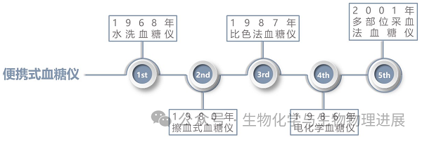 血糖仪是一种用于测定血液中葡萄糖浓度的生物医学传感器,是糖尿病人在医院和家庭中常用的一种快速诊断和病情监测手段[6]。目前为止,血糖仪总共经历了五个发展阶段(图1):水洗血糖仪、擦拭式血糖仪、比色法血糖仪、电化学血糖仪和微型多位血糖仪。