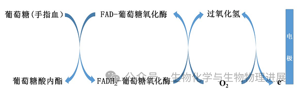 最常见的便携式血糖仪是电极式血糖仪,它是一种电流型酶传感器,以一次性使用的葡萄糖氧化酶修饰的印刷电极作为传感器,将生化信号转换为可定量测定的电信号,进而实现对血糖浓度的测定[8](图2)。