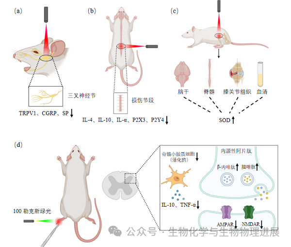 光疗:光疗是一种利用可见光或近红外光对局部组织或全身照射进行治疗的方法。治疗过程中,光能被吸收并引发一系列生物化学反应,从而改变细胞的活动和功能[13-14],促进细胞代谢、改善血液循环、减轻炎症反应,以及助于组织修复和疼痛缓解。例如,激光照射TMD大鼠下调三叉神经节中TRPV1、CGRP、SP表达水平(图3a);激光照射SCI大鼠的损伤部位降低脊髓IL-4、IL-10、IL-α、P2X3、P2Y4表达水平(图3b);激光照射KOA大鼠增强脑干、脊髓、膝关节组织和血清中SOD的酶活性,增强抗氧化能力(图3c);在大鼠足底切口模型中,100 lx绿光照增强了吗啡药物的镇痛作用,其主要机制与增加大鼠内源性阿片肽(β内啡肽和脑啡肽)水平,降低突触后膜谷氨酸受体表达,抑制小胶质细胞活化有关(图3d)。