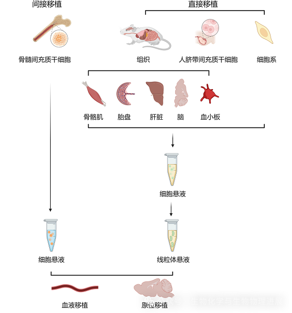 图2 线粒体移植的来源及方式(以神经系统为例)(图片素材来自Biorender)