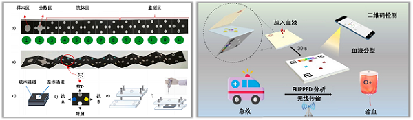图4 基于新型纸基微流控的血型检测技术。(左)用于比色检测血型的3D µPAD[11];(右)基于纸基二维码的快速血型识别技术[12]。