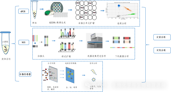 随着分子生物学技术的飞速发展,数字PCR(digital PCR,dPCR)[3]、二代测序(next-generation sequencing,NGS)[4]以及一些基于纳米技术的生物传感器都可以对ctDNA进行检测,并且具有较高的灵敏度和特异性。(详情请点击阅读原文)