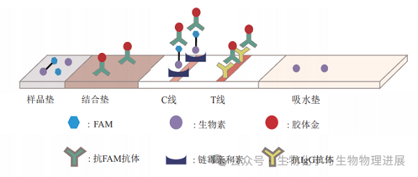 侧向流动分析试纸条。相信大家对侧向流动分析试纸条并不陌生。通常情况下,我们将可能含有目标物的样品滴加到试纸条的样品垫上,它就可以通过毛细管力将样品迁移到结合垫上,目标物可以与结合垫的标记材料结合在一起,然后继续在试纸条上迁移,继而与硝酸纤维素膜上的反应元件结合,最终到达吸水垫,这就是样品在试纸条上反应的全过程。使用者可以通过硝酸纤维素膜上的测试线(T线)与控制线(C线)的颜色变化来判断样品中是否含有目标物。试纸条的信号输出和判别方式特别简单,把CRISPR/Cas系统可检测食源性致病菌的特性与试纸条的信号输出方式结合起来,将会使食源性致病菌的检测更加方便快捷。如图所示,研究者们利用生物素-链霉亲和素系统,把CRISPR/Cas系统所使用的信号报告探针作为检测对象,通过试纸条中T/C线的显色与否可以反映探针的完整或断裂状态,以此来判断检测物中是否含有食源性致病菌。除了使用生物素-链霉亲和素作为连接系统外,研究者们还使用单链DNA之间的碱基互补配对作为连接系统,其原理与上述的试纸条原理类似,同样反映了CRISPR/Cas系统的信号报告探针的状态是否完整。目前,这些形式的试纸条已经广泛应用在金黄色葡萄球菌、沙门氏菌和蜡样芽孢杆菌等食源性致病菌的检测中[4-5]。