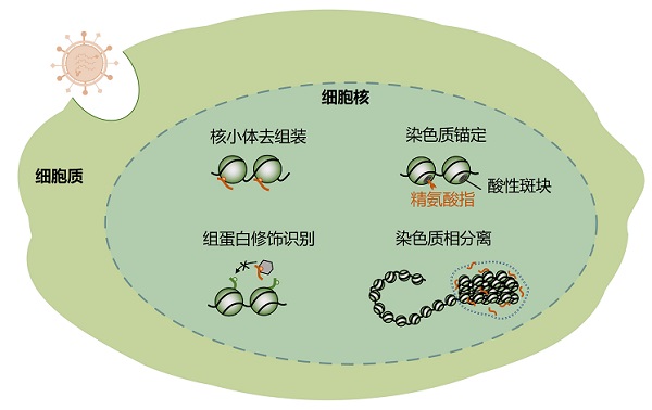 病毒蛋白通过模拟组蛋白伴侣调控核小体去组装,模拟精氨酸指实现染色质锚定,模拟组蛋白序列调节细胞对组蛋白修饰的识别,模拟转录因子调节染色质相分离。橙色碎片代表病毒蛋白。