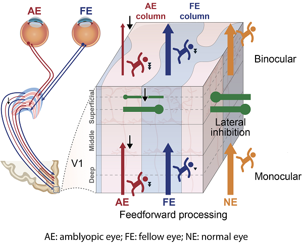 图1. 研究结果的总结示意图:弱视眼信号在传入皮层时已经受损,双眼互相抑制失衡、整合减弱,信号延迟增加。