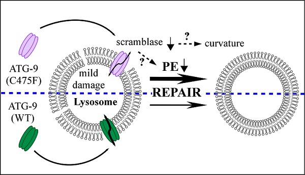 ATG-9是定位于30-60 nm囊泡上的蛋白,在自噬体形成过程中的多个步骤中发挥作用。在酵母中,ATG-9作为"膜的种子"招募自噬机器,促进自噬膜的起始。同时,ATG-9具有促磷脂翻转酶活性,可调节膜脂质的不对称分布,影响膜形态和功能,从而促进自噬隔离膜的延伸。值得注意的是,ATG-9除了参与自噬过程外,哺乳动物中的ATG9A还参与协调ESCRT机器修复质膜损伤。张宏团队前期鉴定的新自噬基因epg-5的突变体中,自噬体和非降解自噬溶体大量积累,造成自噬底物的累积以及溶酶体轻度受损。张宏团队发现,在epg-5突变线虫中,ATG-9小泡可选择性聚集至轻度受损的溶酶体周围。令人惊讶的是,当ATG-9的促磷脂翻转酶活性减弱时,可显著促进轻度受损溶酶体的修复,并提高溶酶体活性,从而挽救自噬缺陷。