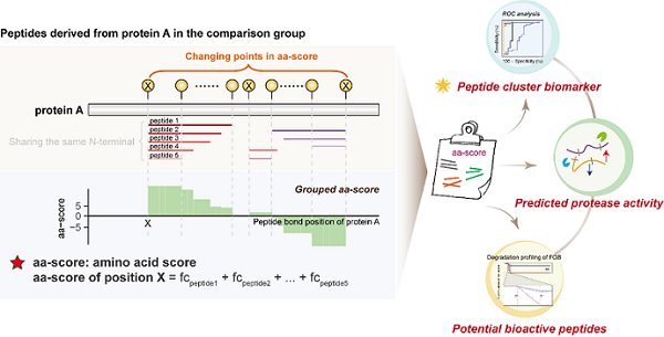 2025年11月18日,中国科学院生物物理研究所蛋白质科学研究平台蛋白质组学技术实验室杨福全团队及其合作者在《Advanced Science》发表了题为"Single-Position Peptide Clustering for Peptidomics Reveals Novel Disease Biomarkers and Dysregulated Proteolytic Characteristics"的研究论文,提出了一种基于单一位点的多肽聚类的肽组学研究新策略。该策略的创新之处在于,基于蛋白质水解所产生的多肽的复杂性和位点的特异性,引入了"氨基酸评分"(aa-score)这一核心算法,不再孤立看待每一条多肽,而是对来自同一蛋白质、具有同一特征性氨基酸位点的所有冗余多肽进行综合量化打分。该策略将蛋白质水解产生的多肽的多样性有序地整合成单一位点肽簇,并将这些肽簇视为一个整体的功能单元进行全面评估。同时,该策略直接将底物、特定的蛋白酶活性及其在疾病病理生理学中的意义联系起来,提供了一个更具生物学解释力的分析框架,实现了疾病相关肽组学数据分析思路的根本转变。此外,团队还提出了"基于氨基酸位点的多肽簇类生物标志物"这一全新概念,成功地将大量的看似杂乱的多肽信息转化为清晰的"诊断密码"。在β-地中海贫血的临床应用研究中,团队不仅识别了新型的多肽簇类生物标志物,还为理解如AHSG蛋白水解失调等过程提供了机制上的深刻见解。这一研究为肽组学领域带来了新的视角,有望推动疾病诊断和治疗的进一步发展。
