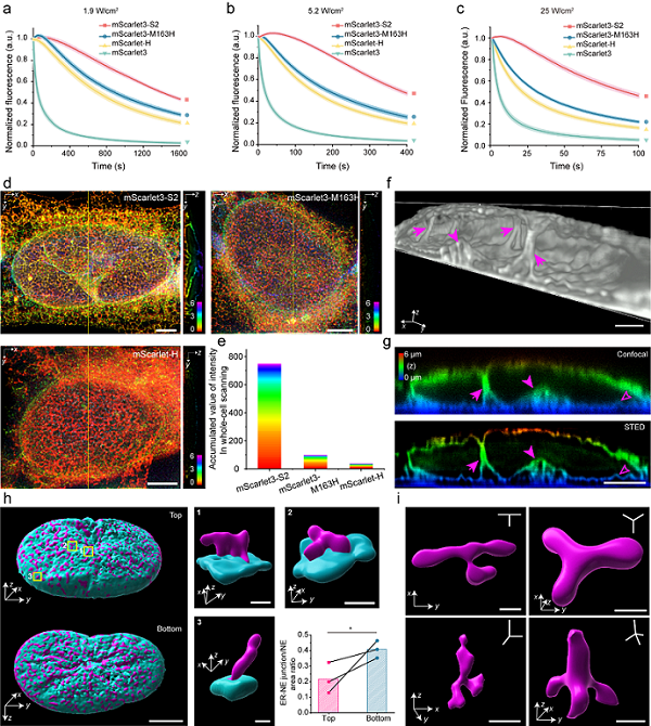 图. a-c.不同能量密度条件下,mScarlet3-S2的光稳定性. d-e. 不同RFP标记的内质网的3D-STED成像结果. f-g.内质网内陷至细胞核中的核质网结构. h. 内质网与核膜互作位点分布图. i.内质网平面及非平面的三向及四向连接结构.