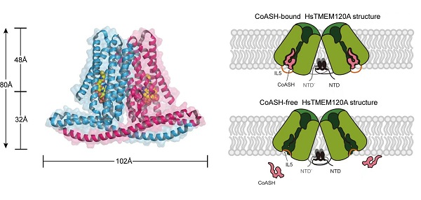 左:人源TMEM120A同质二聚体与CoASH分子形成的复合物