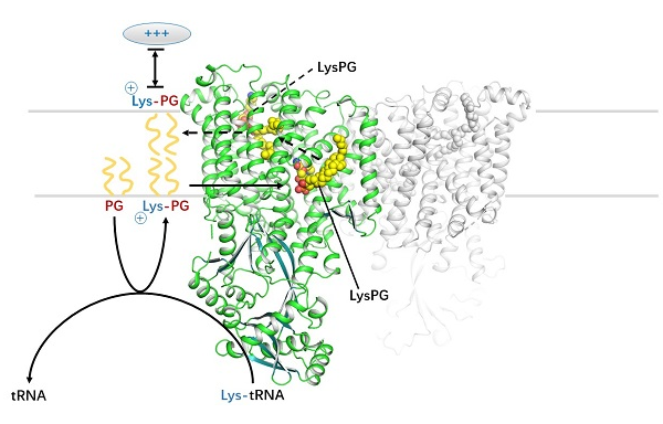 一种双功能膜蛋白MprF介导的氨基酰磷脂合成和转运机制及其与细菌耐受阳离子抗菌肽的关联原理