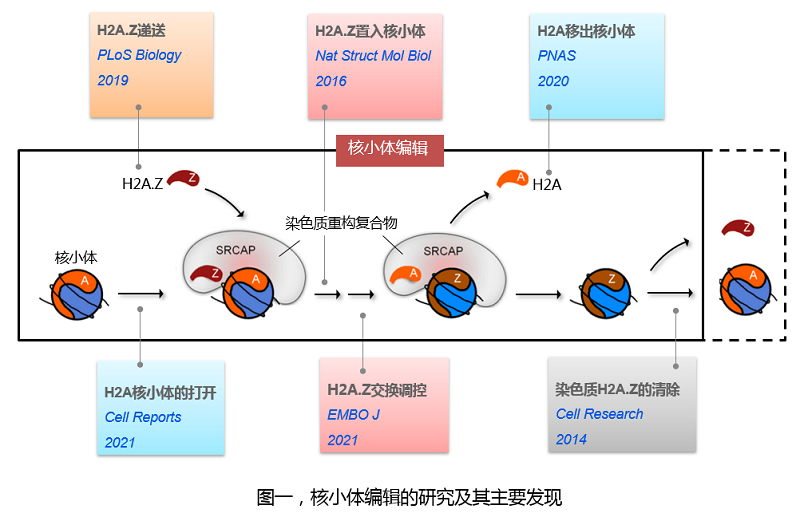 研究染色质重构复合物如何催化组蛋白变体对常规组蛋白进行替换,以及如何实现核小体编辑的人工操控。核小体编辑通过将组蛋白H2A变体精准定位到基因组特定区域进行基因表达调控,其功能异常与癌症等多种疾病密切相关。阐明核小体编辑的作用机制有助于新型表观遗传编辑技术的研发(图一)。