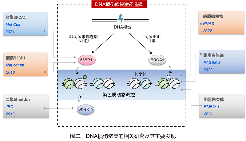 研究细胞如何选择特定的修复途径对DNA损伤进行修复。DNA损伤"合成致死"效应在癌症治疗中的作用,催生了PARP抑制剂等一线抗癌药物,阐明DNA损伤修复的调控机制有助于发现新的药物靶点,促进抗癌药物的研发(图二)。
