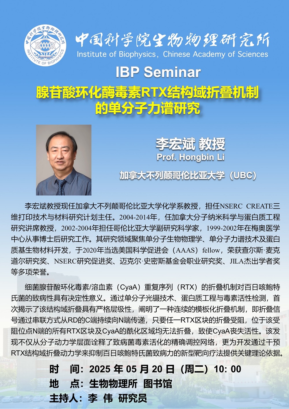 2025年5月20日上午10:00 IBP Seminar:腺苷酸环化酶毒素RTX结构域折叠机制的单分子力谱研究