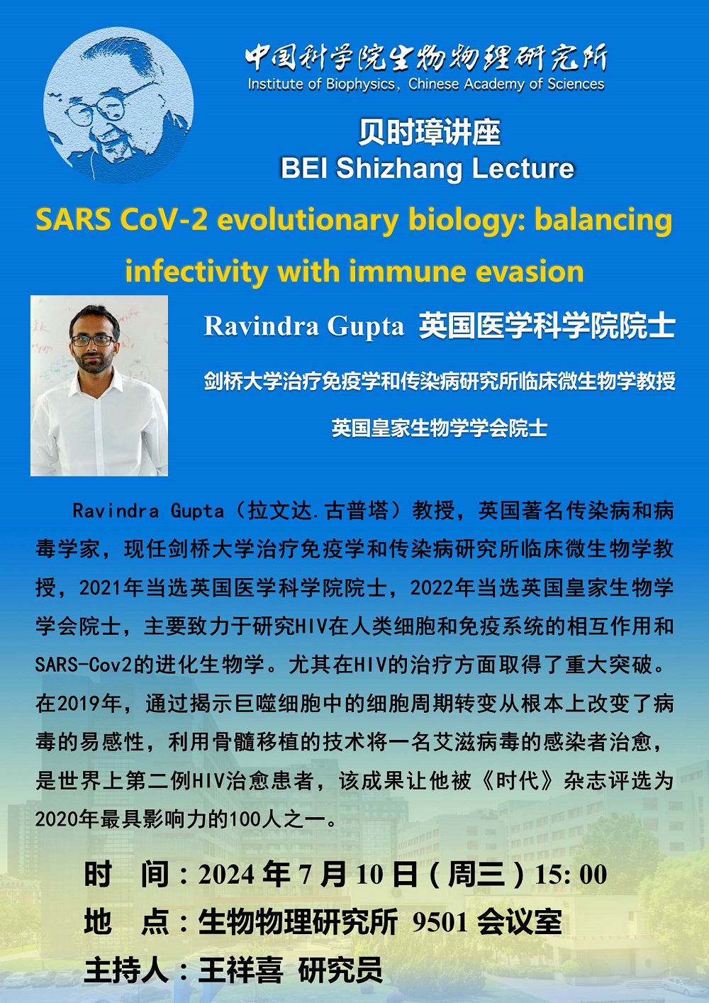 2024年7月10日下午15:00 贝时璋讲座:SARS CoV-2 evolutionary biology: balancing infectivity with immune evasion