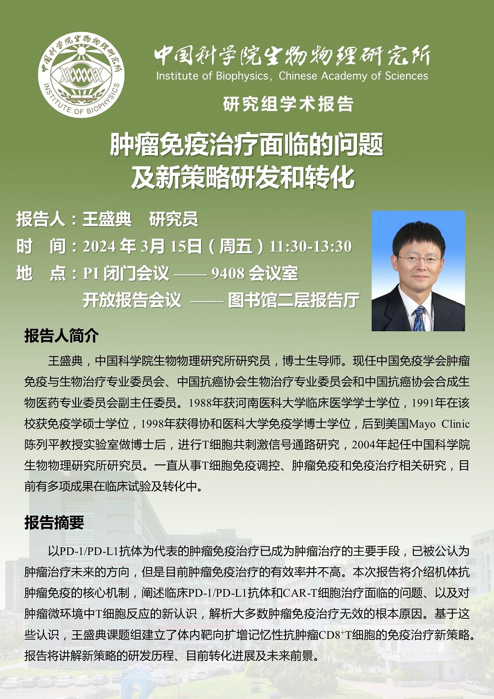 2024年3月15日中午11:30 研究组学术报告:肿瘤免疫治疗面临的问题及新策略研发和转化