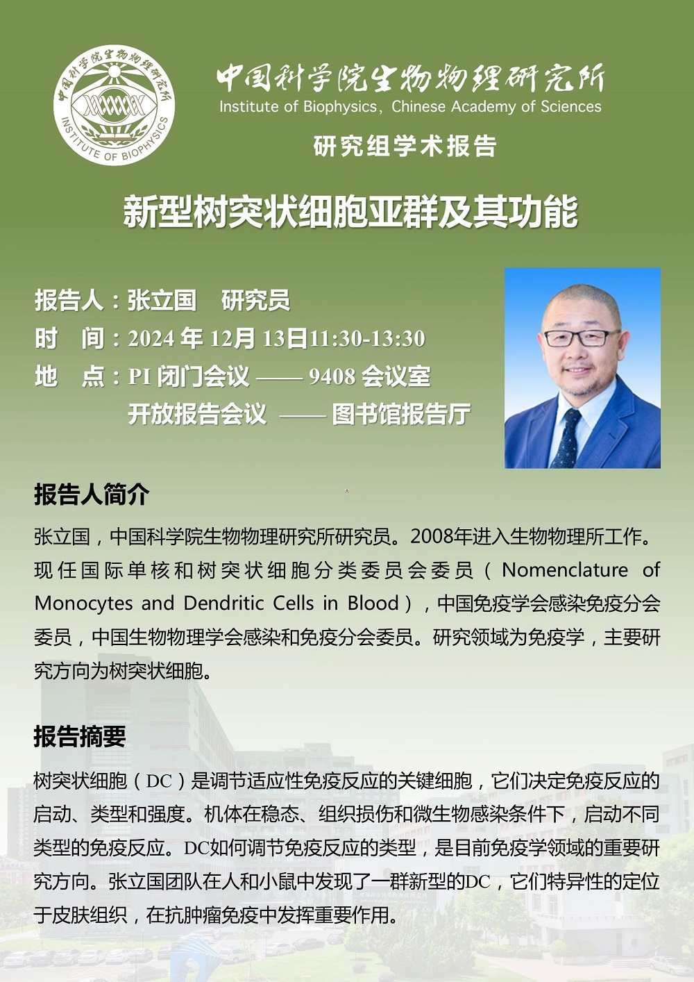 2024年12月13日中午11:30 研究组学术报告:新型树突状细胞亚群及其功能