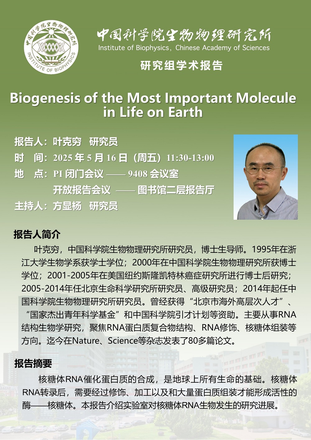 2025年5月16日上午11:30 研究组学术报告:Biogenesis of the Most Important Molecule in Life on Earth