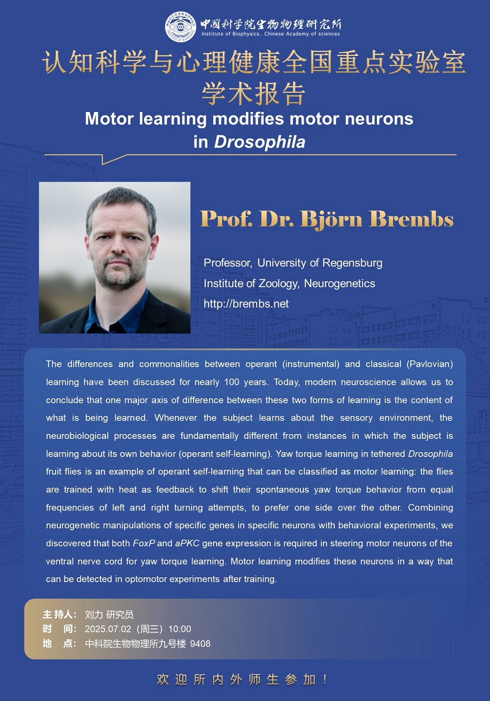 2025年7月2日上午10:00 认知科学与心理健康重点实验室学术报告:Motor learning modifies motor neurons in Drosophila